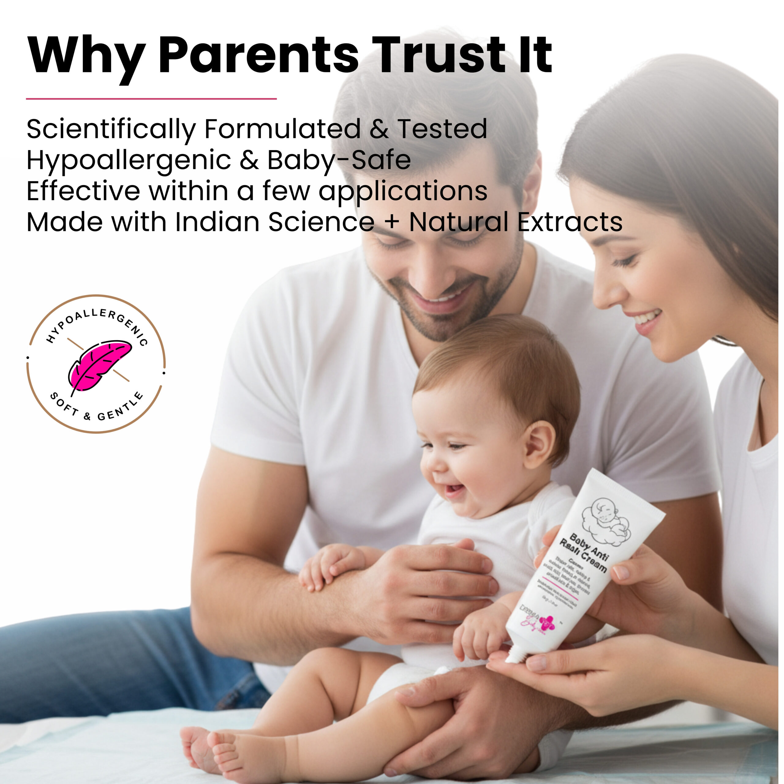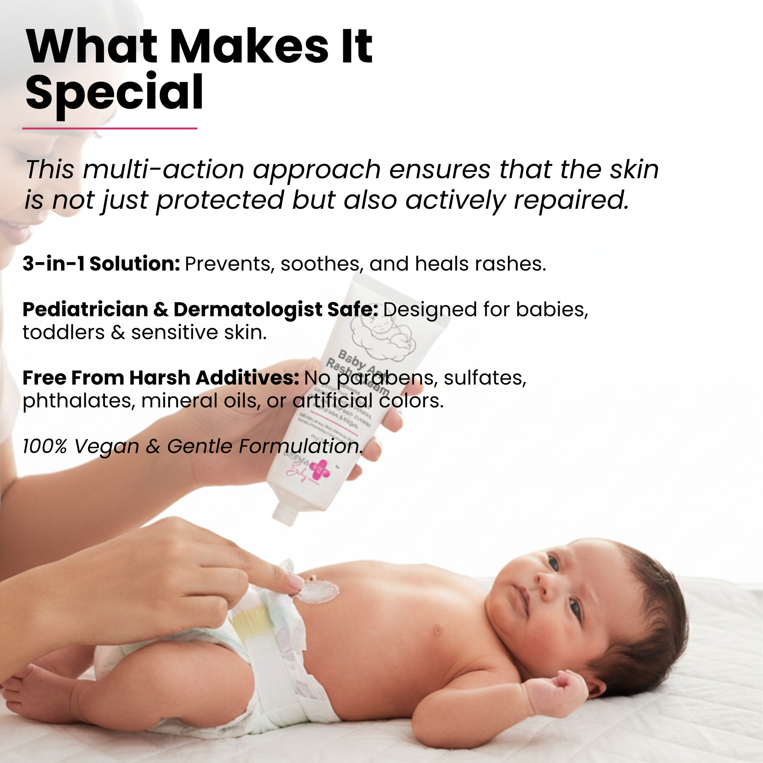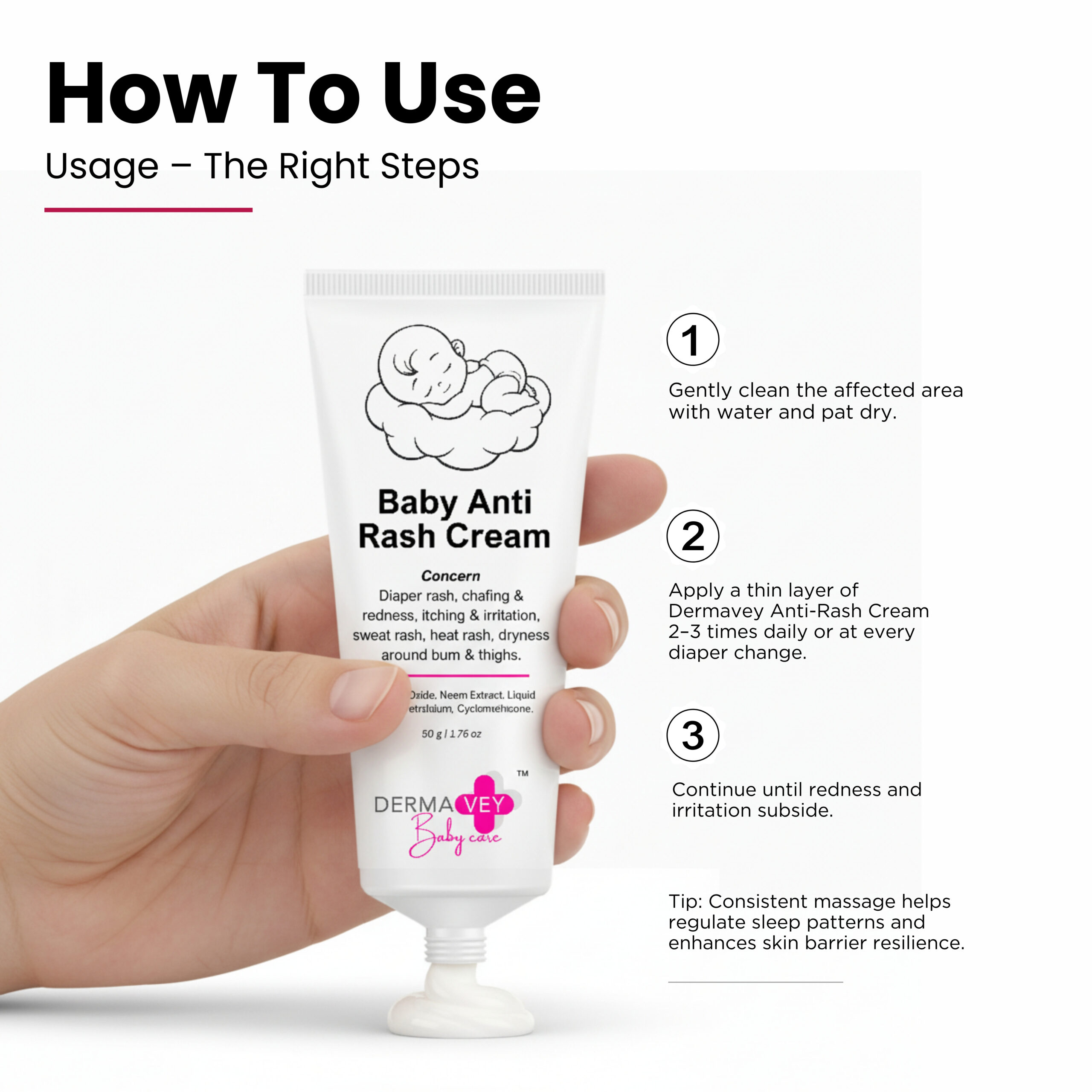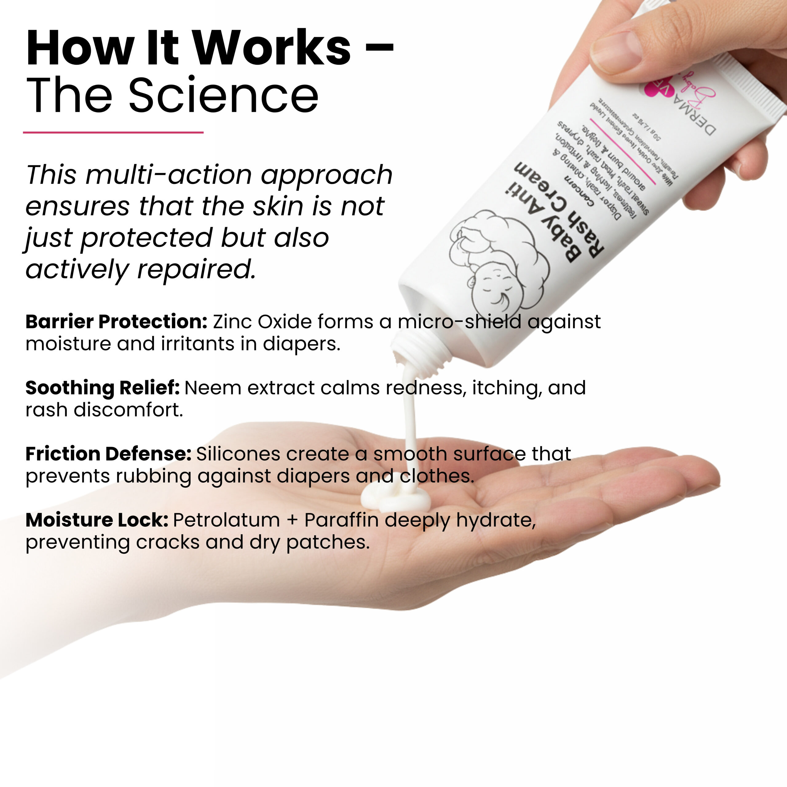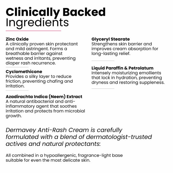 Gentle defense for sensitive skin. This cream is specifically formulated to address Diaper rash, chafing & redness, itching & irritation, sweat rash, heat rash, and dryness around the bum and thighs. It is made with Zinc Oxide, Neem Extract, Liquid Paraffin, Petrolatum, and Cyclomethicone to soothe and protect delicate baby skin. The cream comes in a 50g / 1.76 fl oz size.