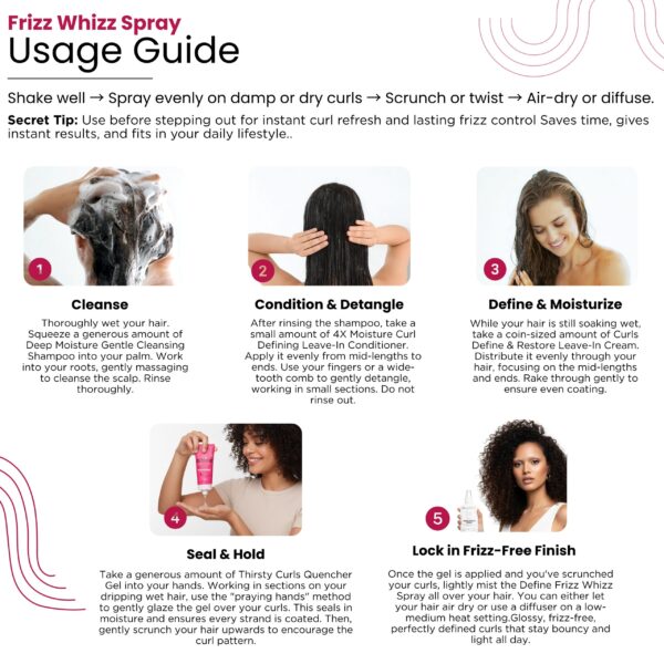 Total curl transformation is here! This is the ultimate ‘Curl-verse’ reset button featuring five products for maximum definition, moisture, and zero frizz. Start with the Deep Moisture Gentle Cleansing Shampoo and 4x Moisture Curl Defining Leave-In Conditioner for a hydration blast (3x moisture!). Lock in protein power and shine with the Curls Define & Restore Leave-In Cream. Finish your look with the Thirsty Curls Quencher Gel for a strong, bouncy hold, and mist with the Define FRIZZ WHIZZ SPRAY (Bi-Phase Mist) for a glossy, crunch-free, frizz-free finish all day.