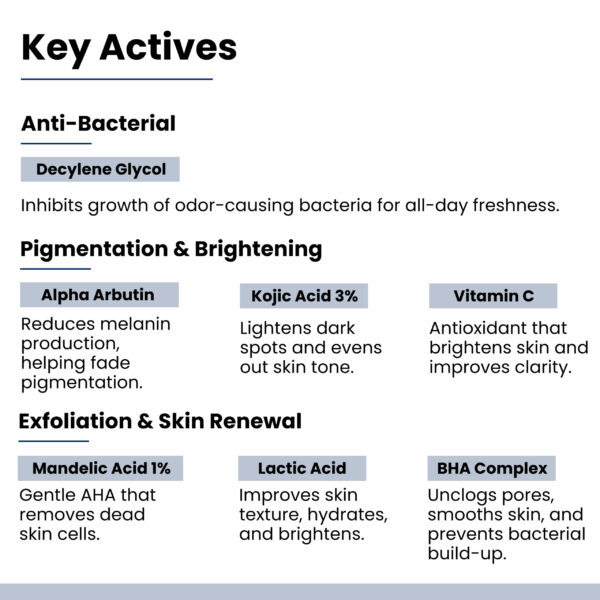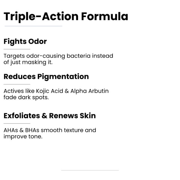 - COMBAT BODY ODOR: Experience a groundbreaking solution for body odor! This AHA BHA-based formula targets and eliminates odor-causing bacteria, effectively masking unpleasant scents throughout the day. With consistent use, it also hydrates dry underarms and diminishes pigmentation.