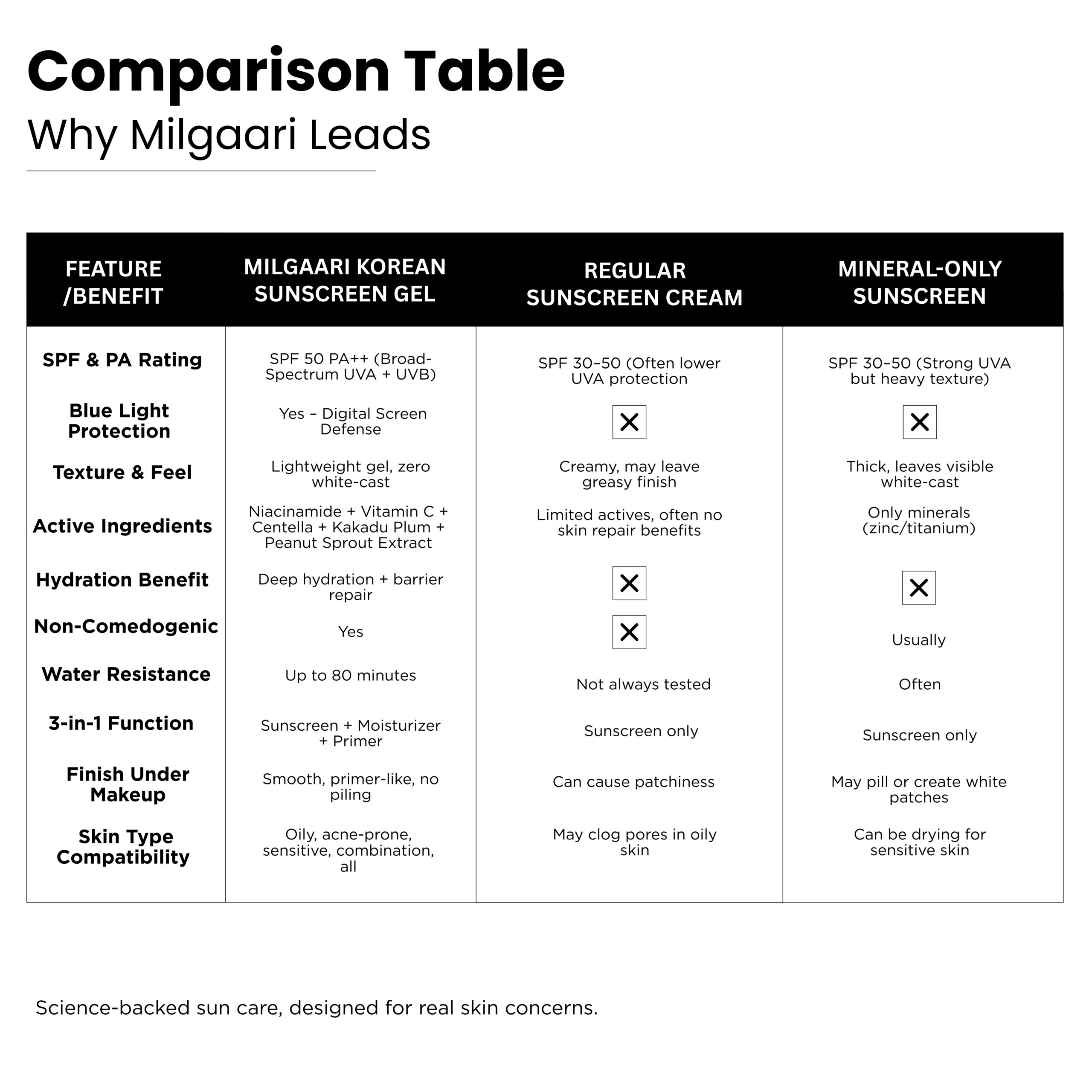 - SPF 50PA++ GEL Protection: Milgaari sunscreen provides broad spectrum UVA/UVB protection with SPF 50+ to shield your skin from harmful sun rays.